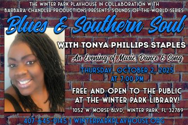 As part of their Sounds of the World Series of events, The Winter Park Playhouse has teamed up with Barbara Chandler Productions to present -Blues and Southern Soul - Thursday October 2 at 7:00 pm. This event will feature professional vocalist Tonya Phillips Staples with Robert Bradley accompanying on piano. The evening will be FREE of charge and held at the Winter Park Public Library in their Edyth Bush theatre at 1052 W Morse Blvd, Winter Park, FL 32789. Doors open for seating at 6:00 p.m. with the performance beginning promptly at 7:00 p.m.